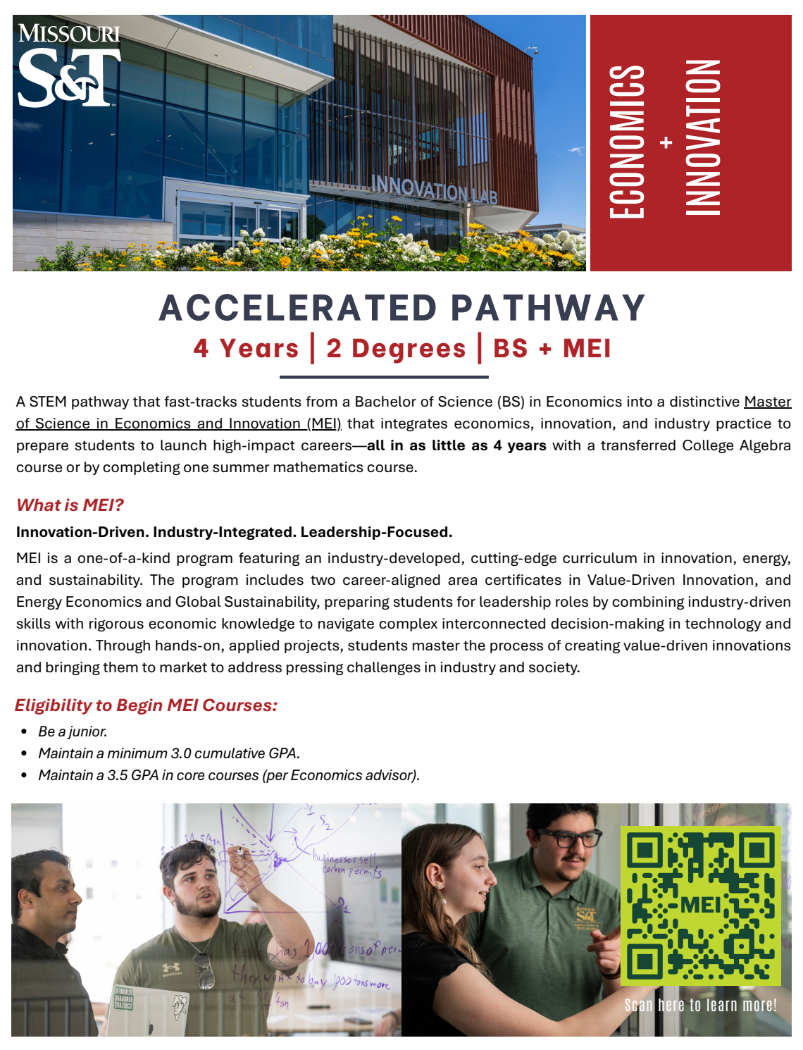 A STEM pathway that fast-tracks students from a BS in Economics into a distinctive MS in Economics and Innovation (MEI) program that integrates economics, innovation, and industry practice to prepare students to launch high-impact careers—all in as little as 4 years with a transferred College Algebra course or by completing one summer mathematics course.