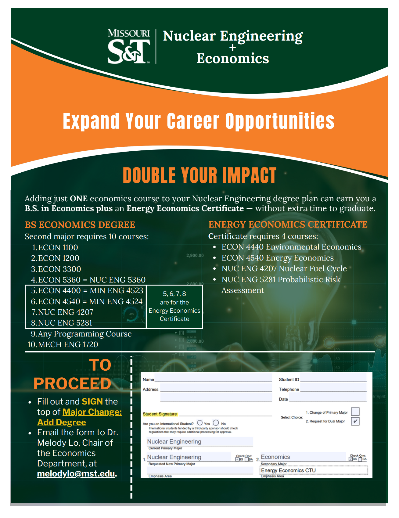 By adding just ONE Economics course to your Nuclear Engineering degree plan, you can earn a B.S. in Economics along with an Energy Economics Certificate—without extending your time to graduate.